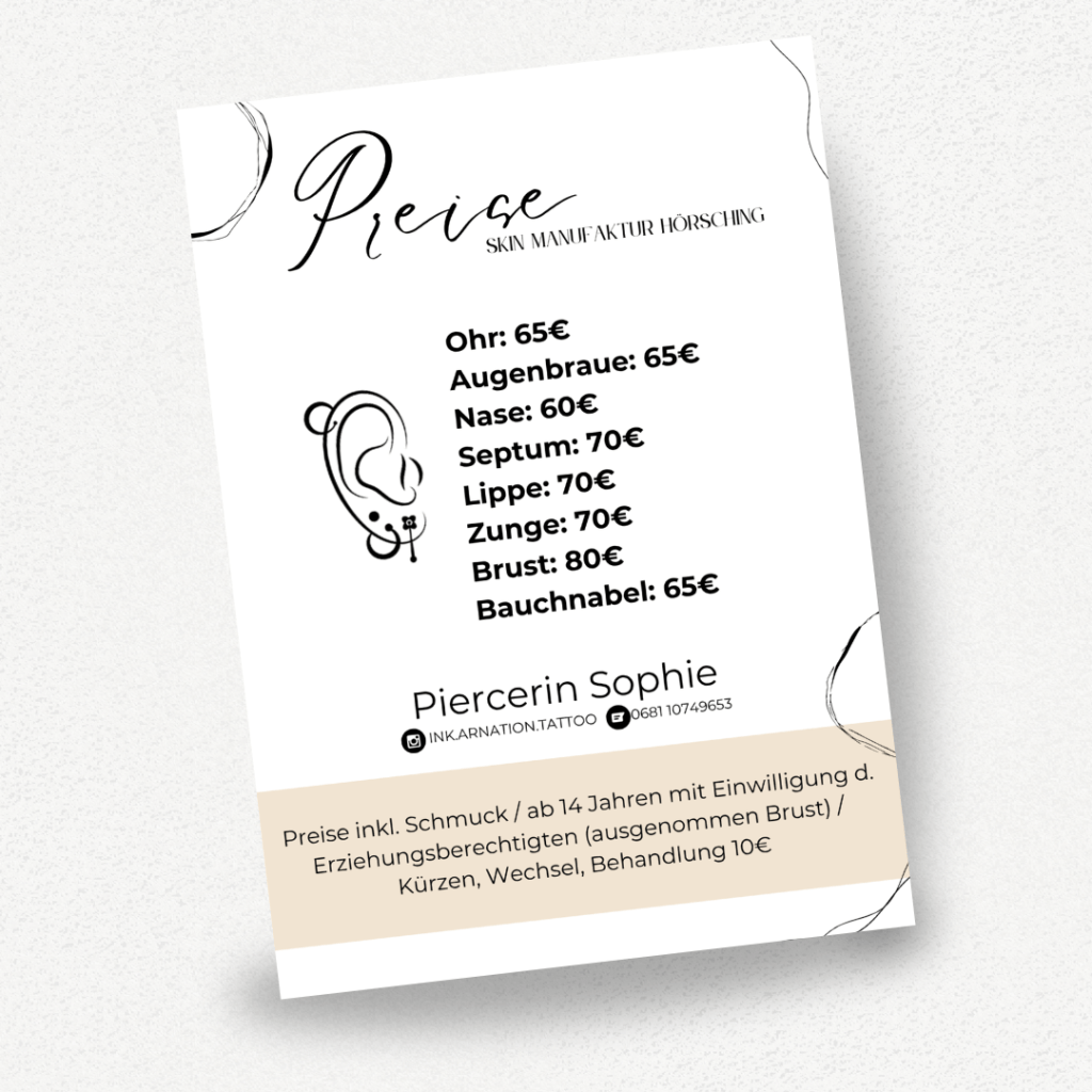 Anzahlung: Für eine verbindliche Terminreservierung hebe ich eine Anzahlung in Höhe von 100€ ein, diese bitte bar im Studio vorbei bringen. Die Anzahlung wird beim Termin selbstverständlich gegen gerechnet.